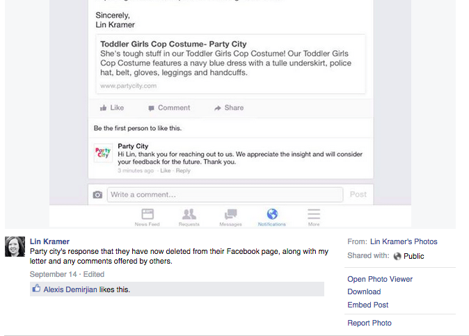 Party City replied to Kramer’s letter by saying it would consider her feedback. In a strange turn of events, Kramer’s post and its response were deleted from Party City’s Facebook page. Kramer was also blocked from commenting on the page.